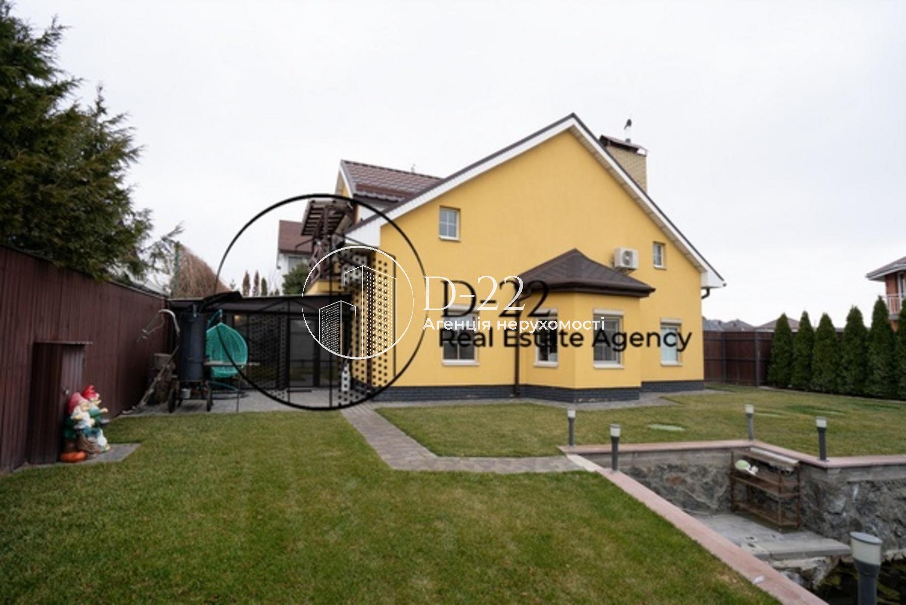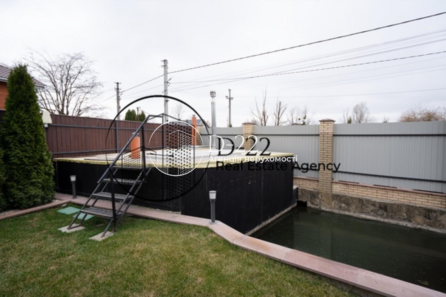 Доглянута територія з водоймою, газоном та автоматичною системою поливу.